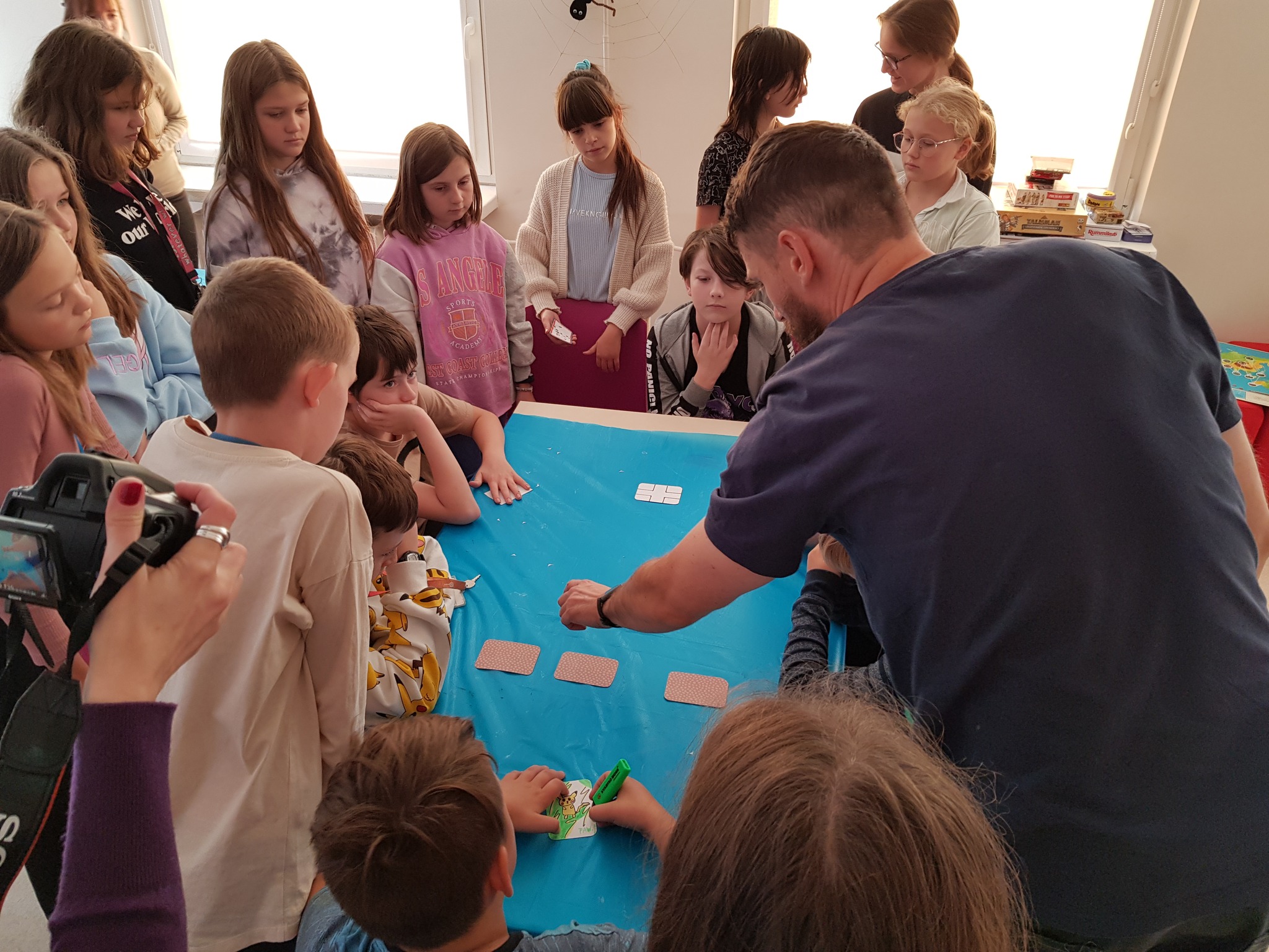 Dnia 23 września 2022r. w nowo powstałej Planszowej Strefie Mola Książkowego, w ramach projektu "Roz(g)rywka literacka” odbyły się warsztaty ilustratorskie z Pawłem Zarębą - autorem grafiki go gry "Kroniki Archeo. Dookoła świata". W spotkaniu uczestniczyli uczniowie piątej klasy z SP 66. Dzieci stworzyły ilustracje do gry, którą następnie z dużym zapałem testowały.